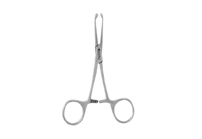 Allis forceps are used to firmly grasping dense tissue during surgery. Teeth curve to the inside and are designed to help decrease general pressure applied to the area.
